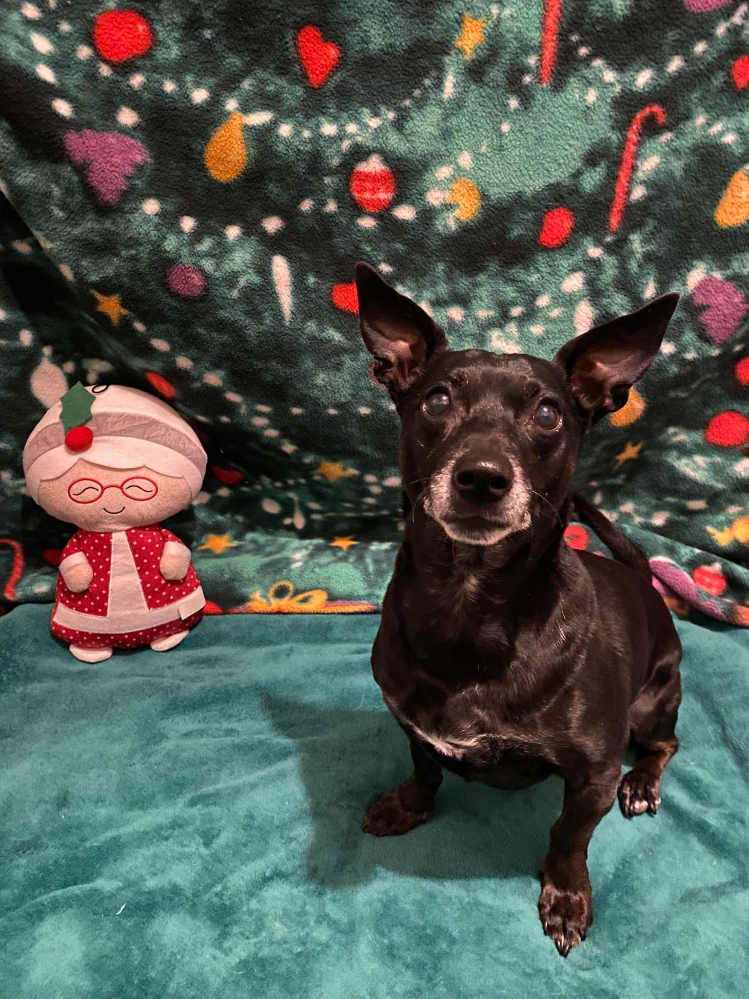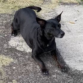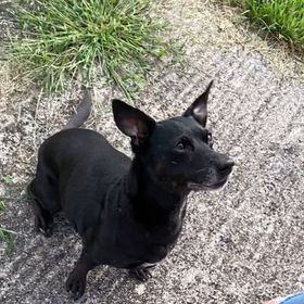 EMMY LOU either loves you or hates you. I personally have never had an issue with her.. but others have… I am not going to lie.. EMMY LOU has lived with other dogs and EMMY LOU has had her ears sewn back on at least 3 times.. She got into scuffles with the other BIGGER dogs, because EMMY LOU thinks SHE is a big dog.. Her first strike was when she was brought here a sad & defeated soul that no one wanted… She was on the euthanazia list.. But, I saw something in her eyes that told me … She did not mean to cause harm.. EMMY LOU is an icon of ISHAS. She was abandoned here twice.. the second time was when her mama moved out of the country leaving her behind.. SHE WAS DEVASTATED.. It took a long time for her to accept the new home here with us.. New people – New dogs, New life. New staff must be trained diligently on how to handle her and then she is their best friend… She steals toys from the other doggies and tears them up and LOVES to eat rabbit poop. YUP – yuck!.. Not a pretty picture for ANY dog looking for a furever home.. As I visited her this morning I thought… EMMY.. I think it is time to LOOK and see if there is ANYONE loving & skilled enough to give you a home that you DO deserve.. I think she agreed with me.. Lately EMMY LOU has chosen other doggies to run in the yard with.. WE WERE THRILLED.. BUT, i still would not recommend a home with other dogs or children because with EMMY LOU you just never know “her mood for the day.” EMMY LOU is also a black fur doggie – they are usually LAST to be adopted for some reason. Her Black fur is not getting gray around her face…🙁 She is an odd mix of a Dachshund, Patterdale Terrier and perhaps a TAD of pitty..She NEEDS a person who CARES and understands her moods.. I shudder thinking she will never know the LOVE a home can give her.. BUT I also know she may NEVER find that home…. so, we spoil her a bit here like always.